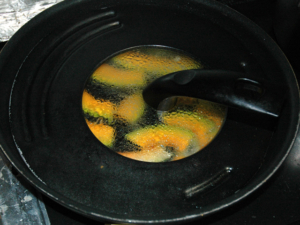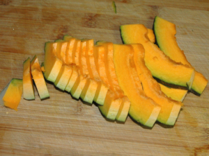 ![]() ①南瓜は種とわたを取り、8mm幅にスライスします。 |