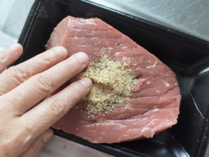 ![]() 2:冷蔵庫から肉を取り出し、オールマイティスパイスを全体に塗り広げます。 3:ラップをして、室温に30分置きましょう。 |