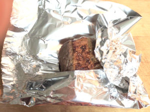 ![]() 6:肉をアルミホイルで包み、1時間ほど肉自体の余熱で火を通せばOK。 |