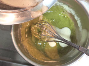 ![]() 9:ふるっておいたアーモンドと薄力粉、抹茶もボールに加え、粉っぽさが無くなるまでグルグルと混ぜます。 (泡立て厳禁) |