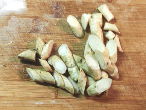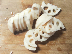 ![]() 1:レンコンは皮をむき、5~6mm厚さの半月切りにします。 |