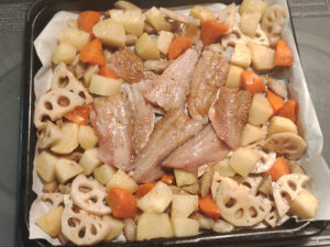 ![]() 9:オーブン用の天板の中央にほっけを重ならないように並べ、周囲に野菜類を並べて準備OK。 |