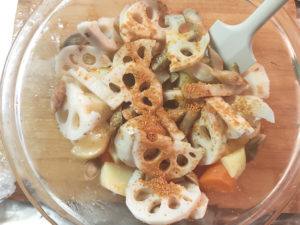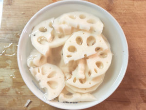 ![]() 2:大きめの容器にレンコンと酢大1と水200ccくらい(共に分量外)を入れて、10分置いてあく抜きをしましょう。 |
