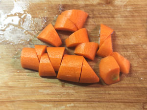 ![]() 4:にんじんは皮をむいて、小さめの乱切りにしましょう。 |