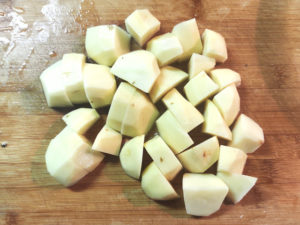 ![]() 5:じゃがいもも皮をむき、一口大に切ります。 |