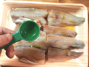![]() 6:ホッケは、オリーブオイルと酒を回しかけ、全体に行きわたるように、手で塗り広げるようにしましょう。 |