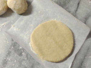 ![]() 16:ベンチタイムが終わったら、クッキー生地を冷蔵庫から取り出し、1つずつ8cmの円になるように伸ばしましょう。 (クッキー生地がべたつくようなら、クッキングシートの上で伸ばすのがおすすめ。) |