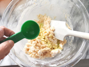 ![]() 3:耐熱ボールに薄力粉をふるって加え、ゴムベラで練らないように、粉っぽさがなくなるまで混ぜます。 |