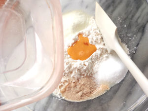 ![]() 6:別のボールに、パン生地の強力粉、グラニュー糖、塩、ドライイースト(塩の反対側に)、スキムミルクを端っこに並べましょう。 7:中央のくぼみに卵を入れ、イーストめがけてぬるま湯を投入します。 |