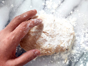 ![]() 10:生地が柔らかいので、途中強力粉(分量外)を3~4度に分けて加えながら、生地の表面が滑らかになるまで、10分ほどしっかりと生地をこねましょう。 |
