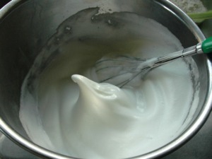 ![]() ①卵白に卵白用の砂糖をひとつまみ加えて泡立て始め、途中で2回に分けて卵白用の残りの砂糖を加えながら、ピンと角が立つまで泡立てます。 |
