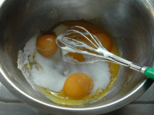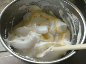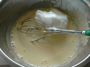 ![]() ⑤卵黄のボールにメレンゲを少量加え、しっかりと混ぜます。 |