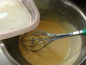 ![]() ③牛乳とサラダ油を一緒の器に入れ、レンジで30秒ほど加熱します。 ④人肌の温度になったら、卵黄のボールに少しずつ加え、その都度良く混ぜます。 |
