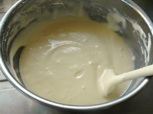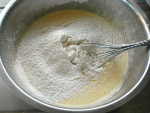 ![]() ⑥卵黄のボールに薄力粉をふるい入れ、粉っぽさがなくなるまで混ぜます。 |