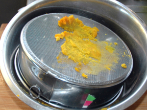 ![]() ケーキを冷ましている間に南瓜クリームを作ります。 ⑪南瓜を適当な大きさに切り、水にくぐらせてから、ラップをしてレンジで8分加熱します。 ⑫皮を取り除いて、温かいうちに裏ごしをしましょう。 |