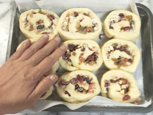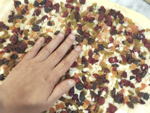 ![]() 11:ドライミックスフルーツを全体に散らし、手で軽く押さえ込むようにします。 (ママパンのドライミックスフルーツを使いました。) |