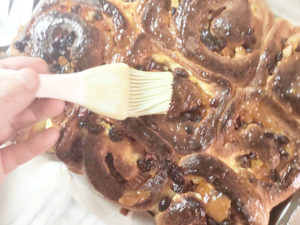 ![]() 16:パンが焼けたら、アプリコットジャムを温めたものをまんべんなく塗り広げます。 |