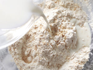 ![]() 2:ぬるめの牛乳を3回ほどに分けて加え、その都度手でこねましょう。 (多少べたつく程度まででOK。) |