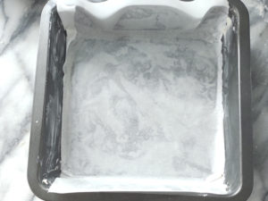 ![]() 5:発酵させている間に、ケーキ型(20×30cmくらい)に塗り用のマーガリンを塗り広げ、クッキングシートを敷いておきましょう。 (底が抜けるケーキ型なら、シートはいりません。) |