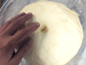 ![]() 6:生地の中央に指で穴をあけてみて、戻らないようなら一次発酵はOK。 7:手の甲でパンチするようにして、ガス抜きをします。 |
