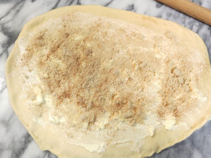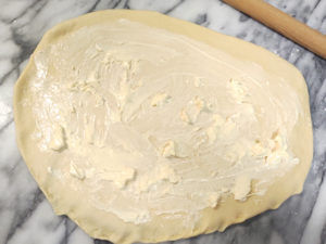 ![]() 8:生地を強力粉(分量外)を少々振った台の上に取り出し、麺棒で長方形になるように伸ばしましょう。 9:フィリング用のマーガリンを乗せ、手で薄く塗り広げます。 |